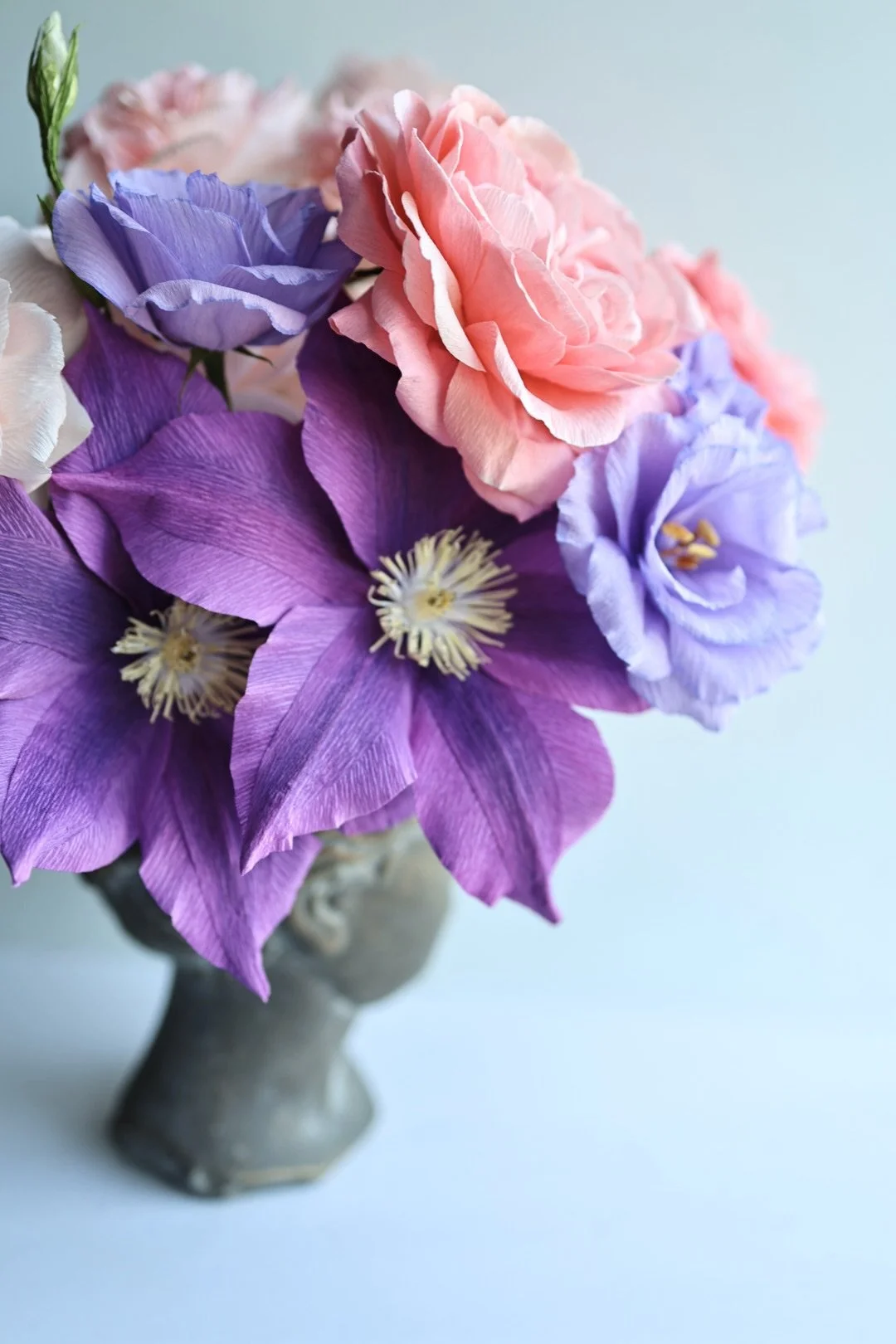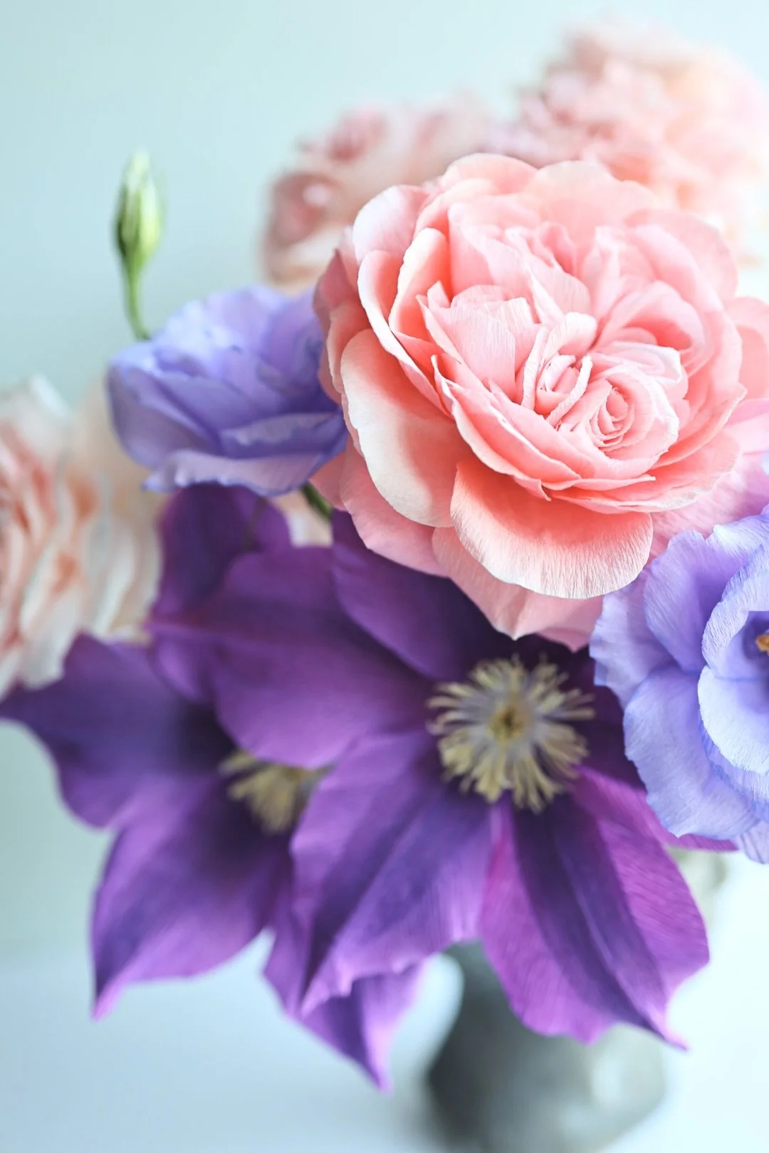 Quynh will guide you through the creation of three botanically realistic paper flowers: the Princess Hitomi garden rose (a Japanese rose with cotton-candy pink petals and a quartered bloom form, named after Hitomi Gilliam herself), a clematis, and a double lisianthus. Each flower is crafted with attention to the living bloom’s petal structure, color, and character.
